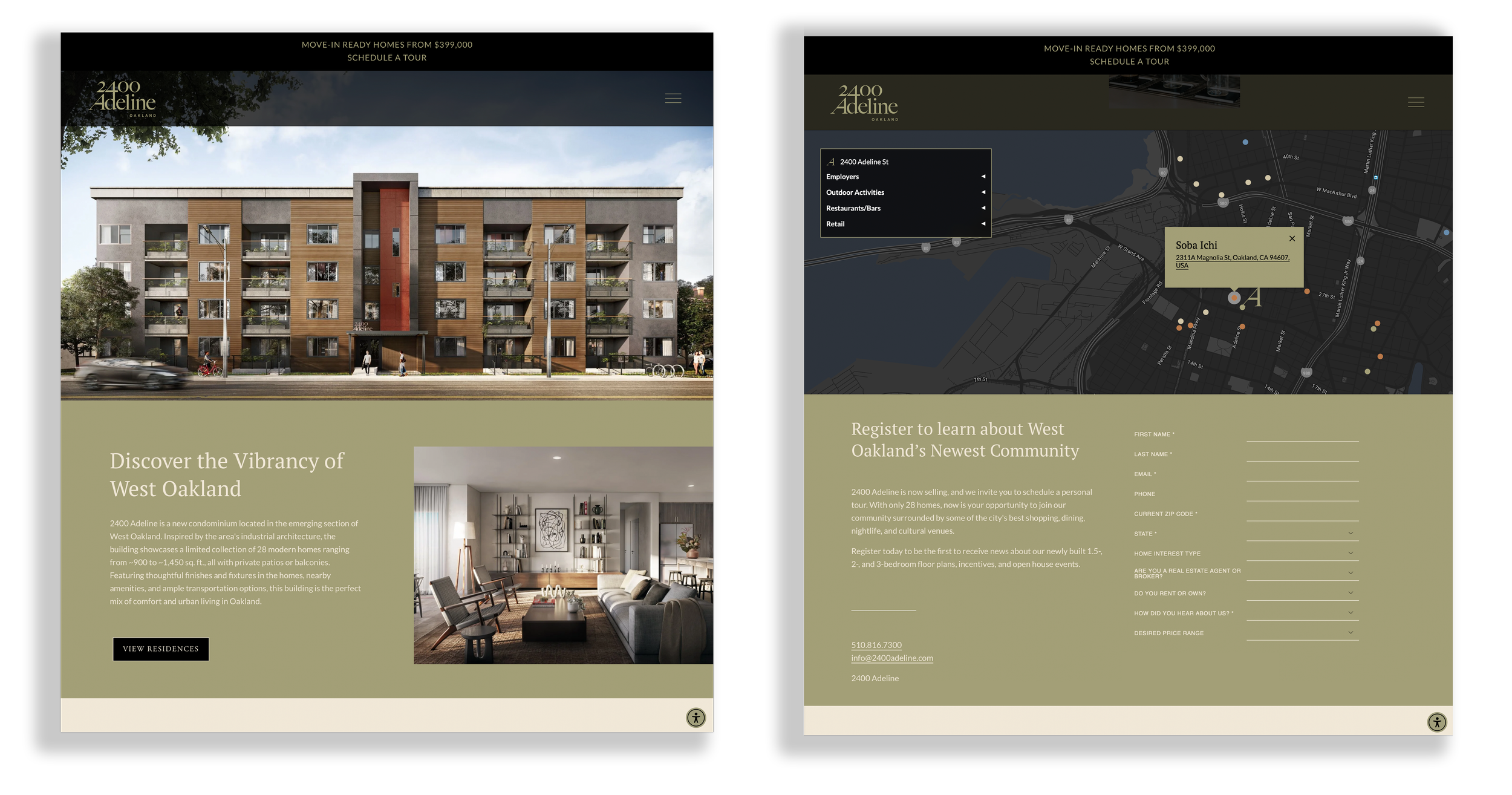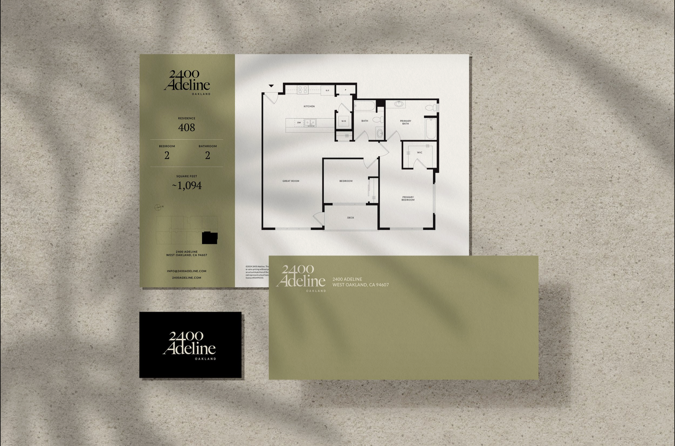 In developing the branding for 2400 Adeline, a modern condominium in West Oakland, I drew inspiration from the area’s industrial architecture. The identity balances raw, urban character with refined design, creating a visual language that speaks to the building’s contemporary aesthetic. From typography to marketing collateral, every element reinforces a sense of modern sophistication, aligning with the unique character of its 28 residences.